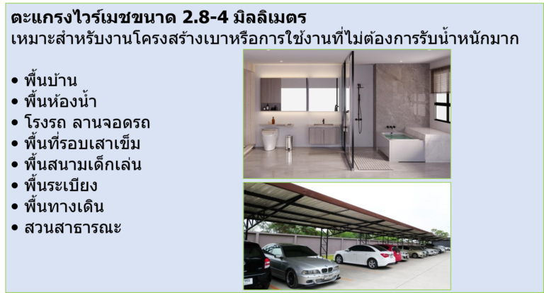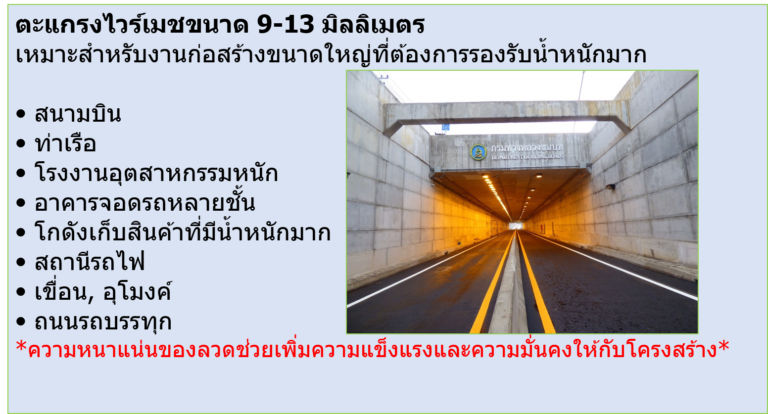 • ประหยัดเวลาและค่าใช้จ่าย: การใช้ตะแกรงไวร์เมชแบบสำเร็จรูปช่วยลดขั้นตอน และเวลาในการผูกเหล็กเส้นทีละเส้นด้วยมือ