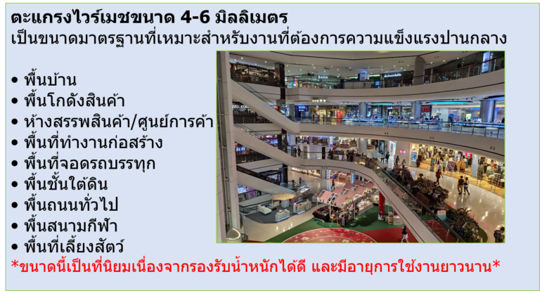 • ขนาดตาห่าง: มีหลายขนาด เช่น 10×10 ซม., 15×15 ซม., 20×20 ซม., 25×25 ซม., 30×30 ซม. หรือมากกว่านี้